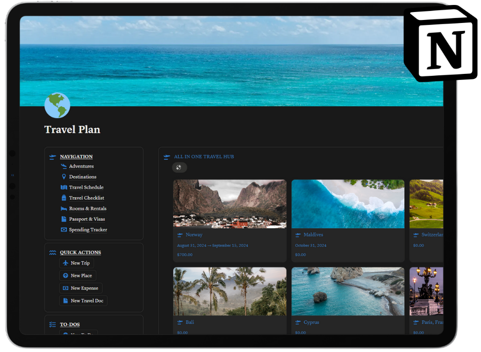 What about a notion template, where you can plan all your trips with budgeting and spots. Others charge around $40 for this template alone. It’s included with the e-Book!